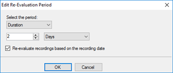 Configure this variable to set the time period for a recording to be re-evaluated. Recordings can be re-evaluated based on the last time a recording was evaluated by a policy, or based on the recording date. In the Edit Re-Evaluation Period dialog box, select the time period from the drop-down list. The available re-evaluation time periods are: Never or Duration. The default time period is Never, which means the recording will never be re-evaluated by the policy. You can modify the retention expiration date manually in Interaction Recorder Client, in the Search Results View. For more information, see "Modify Retention Expiration" in the Interaction Recorder and Interaction Quality Manager Technical Reference, in the PureConnect Documentation Library. When you select Duration,