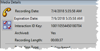 Note: If the server parameter, IR Use Recording Date for Expired Calculations, has been set True in Interaction Administrator, the Re-evaluate recordings based on the recording date check box is not available. For more information on this server parameter, see "Appendix C: Interaction Recorder Server Parameters" in the Interaction Recorder and Interaction Quality Manager Technical Reference, in the PureConnect Documentation Library. You can view the retention expiration date of a recording in the Media Details pane in Interaction Recorder Client in IC Business Manager. After Retention Policies evaluate a recording, in order for the recording to be re-evaluated by the Retention Policies, be sure to create a Retention Policy with the re-evaluation action. This action allows the recording to be re-evaluated by Retention Policies. Note: When a recording matches multiple Retention Policies, the policy with the shortest re-evaluation time interval is used to re-evaluate the recording. For example if a recording matches three retention policies, one with a 3-day re-evaluation interval, another with a 30-day re-evaluation interval, and another policy matches with a 1-year re-evaluation interval, the recording will be re-evaluated in 3 days. |
