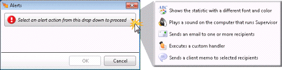 Configuring Interaction Supervisor to set an alert provides notification when a particular metric enters, is within bounds, or is no longer within a user-defined range of values. Alerts can be displayed in Supervisor using color coded icons and text attributes to highlight a metric. Alerts can optionally send email notifications, play sounds, or invoke a handler.