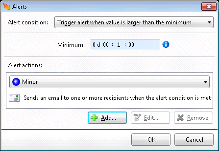 Optionally repeat steps 5-8 to add additional alert conditions and actions. This makes it possible to create an alert that performs more than one action. Actions are listed in the Alert actions pane of the Edit Alerts dialog.