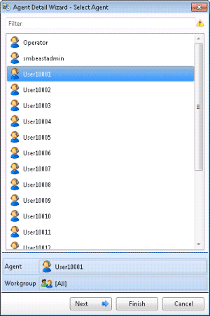 1. Select the name of an agent. You may need to type the name in the Filter box. When more than 20 agents exist in the system, only the first 20 are shown, and an indicator () informs that more agent names are available. In that case, typing part of an agent's name in the Filter box locates the correct agent. When 20 or less agents exist in the system, the filter is not shown.