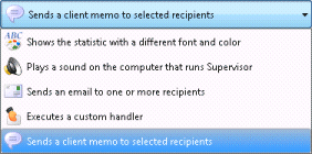 When client memos are configured as alert actions, the dialog offers a drop list that allows the user to select a different action: