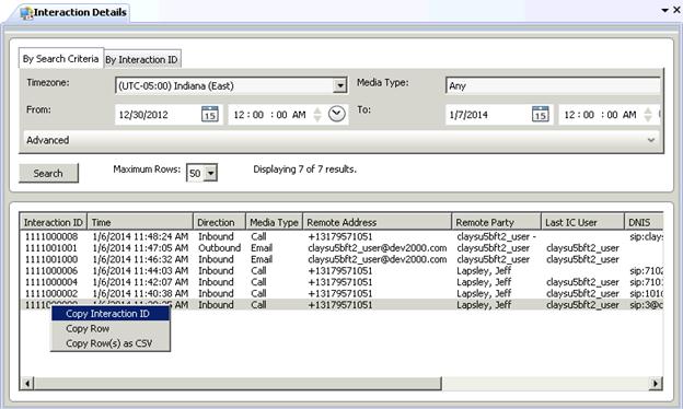 From the search results screen, when a single row is selected, three copy options appear when you right-click to reveal the context menu: Copy Interaction Id, Copy Row, and Copy Row(s) as CSV.