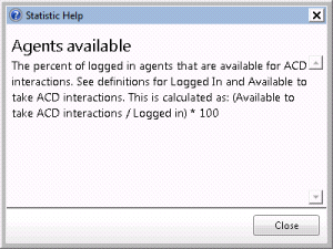 Displays a help definition of the statistic. Click Close to dismiss this dialog when you finish reading the help text. You can also display help for a statistic by holding the mouse pointer over the statistic control until pop-up text is displayed. The help text is the same, regardless of method used to display it.
