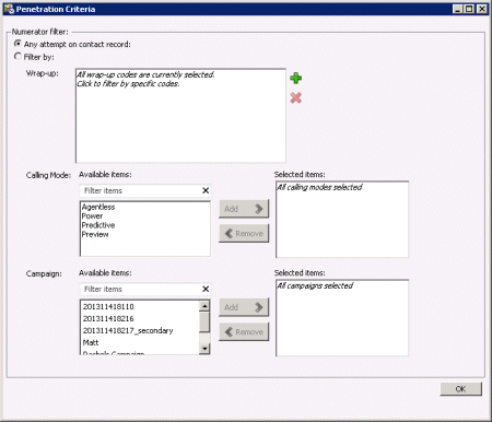 Click Select to open the Penetration Criteria dialog. This dialog allows you to filter the selection of penetration rate records based on wrap-up codes, calling modes, and campaign, or report any attempt to dial contact records. When you finish making selections, click OK to dismiss the dialog.