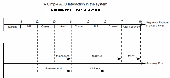 When there are multiple interactions, the stats related to them are summarized according to their workgroup, media type, and report group. To correlate them, it would be necessary to find corresponding Interaction Detail Viewer segments. The purpose of the preceding diagram is not to compare the Interaction detail viewer segment with IWrkGroup Queue statistics. Instead, it is to explain how the statistic collection is mapped between the two data collection modules.
