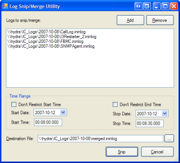 The Log Snip/Merge Utility snips (copies) all or part of a log file to a new file. It can merge entries from multiple logs into a new log file.
