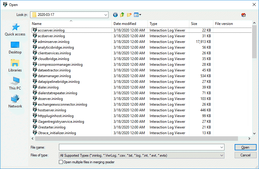 Select a log file. Trace log files have an .ininlog extension. The index for a trace log has an .ininlog.ininlog_idx extension.