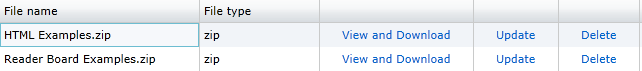| .zip | The .zip files in the file library contain XSL files in folders, which contain CSS, JavaScript, and all other files necessary to support your HTML page. |