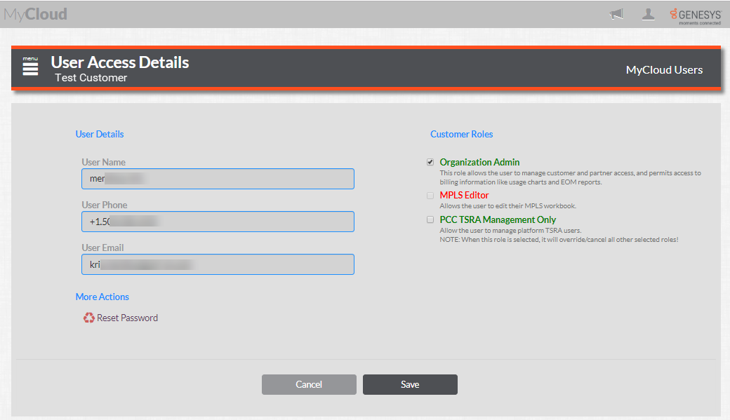 Authorized administrators can grant other potential MyCloud account users access to MyCloud, and access to MyCloud roles that enable them manage different aspects of the company's PureConnect Cloud service. The roles that MyCloud users can have include: