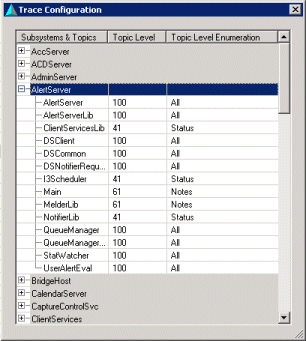 The Trace Configuration dialog appears. Expand a subsystem to see its topics and their topic level and topic enumeration settings.