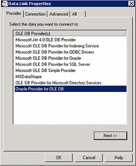Note: Do not select Microsoft OLE DB Provider for Oracle. Microsoft Oracle Provider for OLE DB is listed only if the Oracle Client is installed.