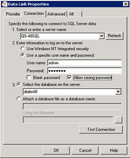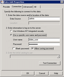 You'll create a database connection file (.UDL) using Microsoft's Data Link Properties utility to define an OLE DB data source that connects a database server with applications. You'll need to create the UDL file before adding a Dialer database connection.