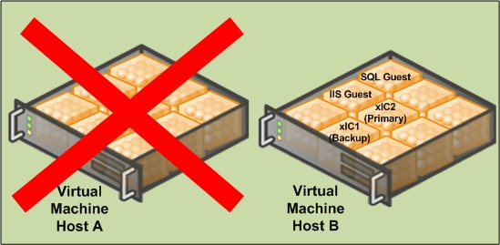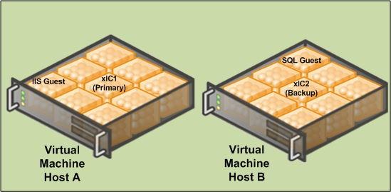 In the diagram below, the Primary Server (IC1) is a guest virtual machine on Host A and the Backup Server (IC2) is a guest virtual machine on Host B.