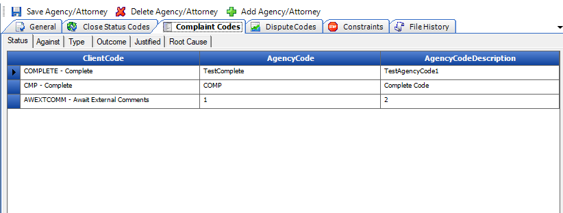 Tabs: Displays the tabs for maintaining agencies and attorneys.