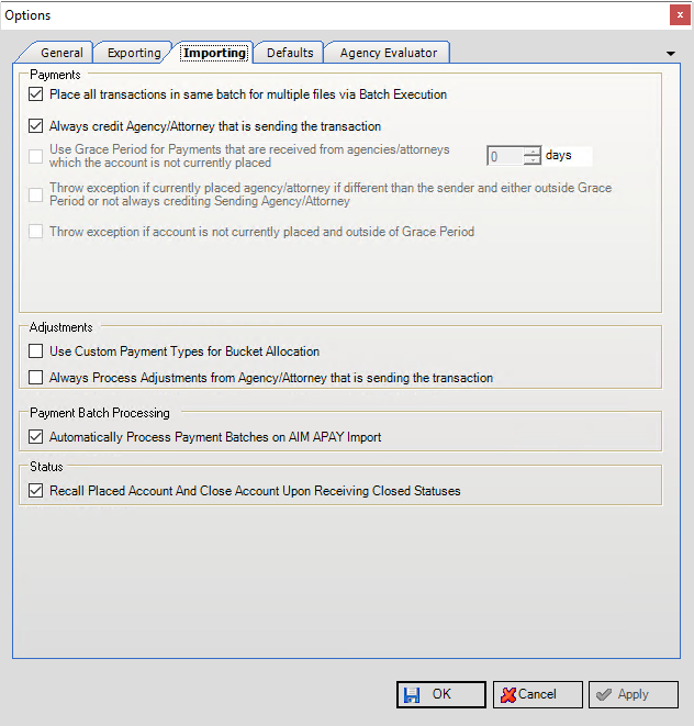 Use Grace Period for Payments that are received from agencies/attorneys which the account is not currently placed: If selected, AIM uses a grace period for payments that it receives from agencies and attorneys that no longer hold the accounts.