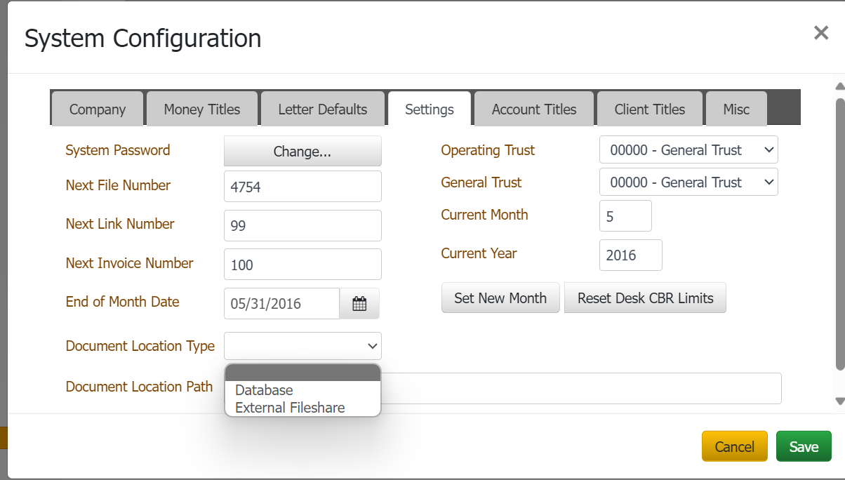 Document Location Type: Database or External File share. Indicates where documents attached to an account should be stored.