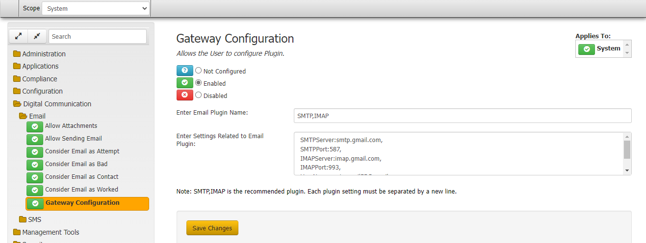 The Plugins used to send and receive Emails is configured here. SMTP and IMAP are recommended plugins. Each plugin setting must be separated by new line.
