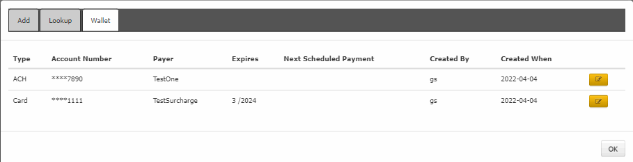 Use the Wallet tab in the Payment Instrument dialog box to edit a credit card, ACH, or paper draft account from the customer's wallet.