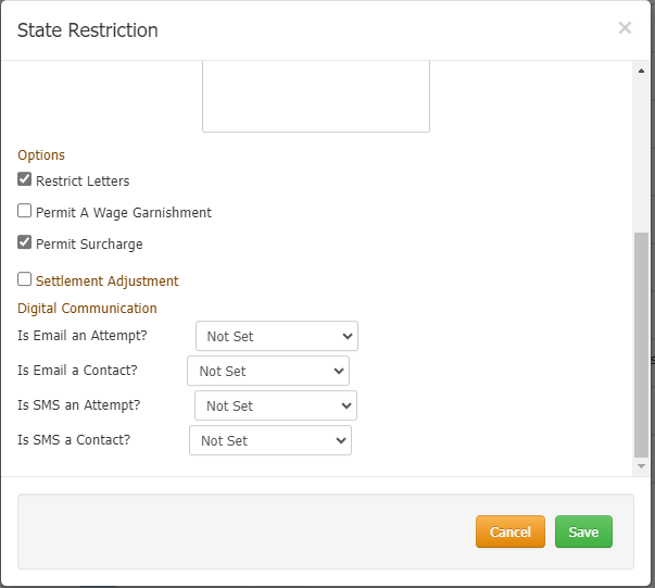 Restrict Letters: If selected, the state restricts the letters you can send to customers residing in the state.
