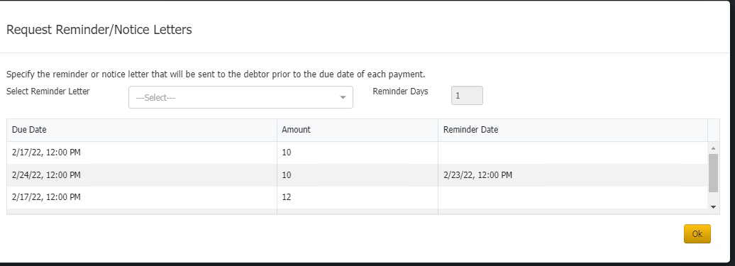 NOTE: Only promise type payments and reminder letters can generate the provided facility using which you can change the number of days prior to the due date of the payment for the Reminder Letter to be sent.