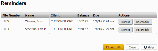 If a reminder exists for an account associated to the desk that you are working and the scheduled date and time have passed, the Reminders dialog box appears.