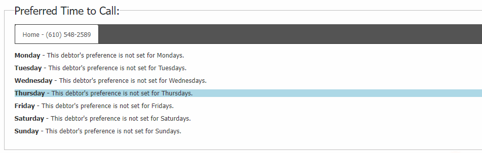 Displays debtor preference call days for entire week.