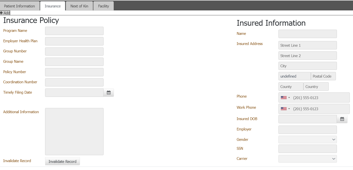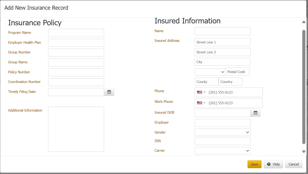 Complete the information and then click Save. The system adds a tab for the insurance policy on the Insurance tab in the Medical panel.