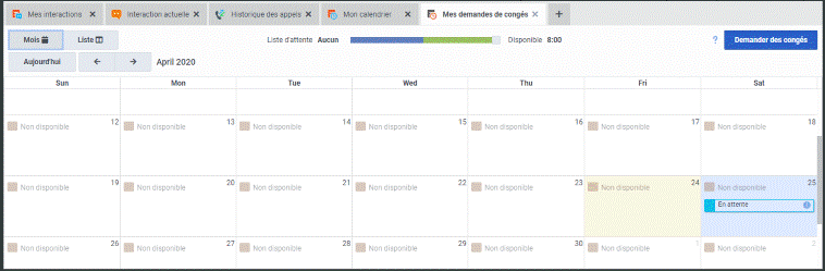 Exigences : vous devez disposer du droit de sécurité Personnaliser le client pour afficher la vue Mes demandes de congés. Pour d'autres exigences, consultez la rubrique Fonctionnalités et exigences d'Agent Optimizer.