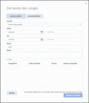 Remarque : les planifications de congés de votre organisation déterminent les sélections disponibles. Vous pouvez vérifier le nombre de congés que vous avez accumulés dans le tableau du Programme au bas de la boîte de dialogue Demander des congés.