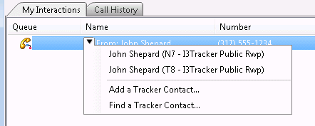 Sélectionnez l'interaction actuelle et cliquez sur la flèche vers le bas de résolution des contacts. Sélectionnez Rechercher un contact Tracker dans la liste déroulante Résolution de contact.