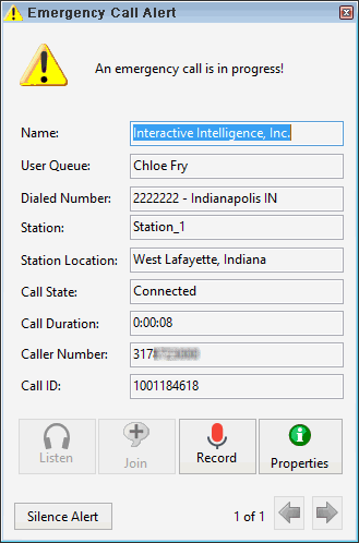 Note: The CIC administrator configures Emergency Information for stations and Managed IP Phones in Interaction Administrator. If this information is not provided, then Name, Station Location, and Caller Number are blank in the Emergency Call Alert.