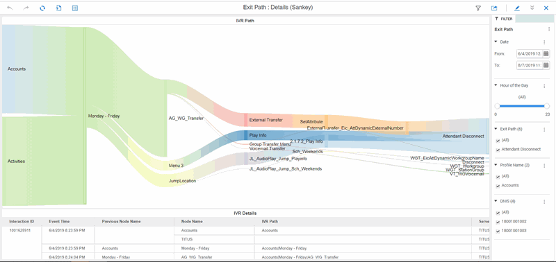 The Exit Path Details with Sankey dashboard displays interaction details in the IVR Details in the form of Sankey. You can easily identify the most used path.