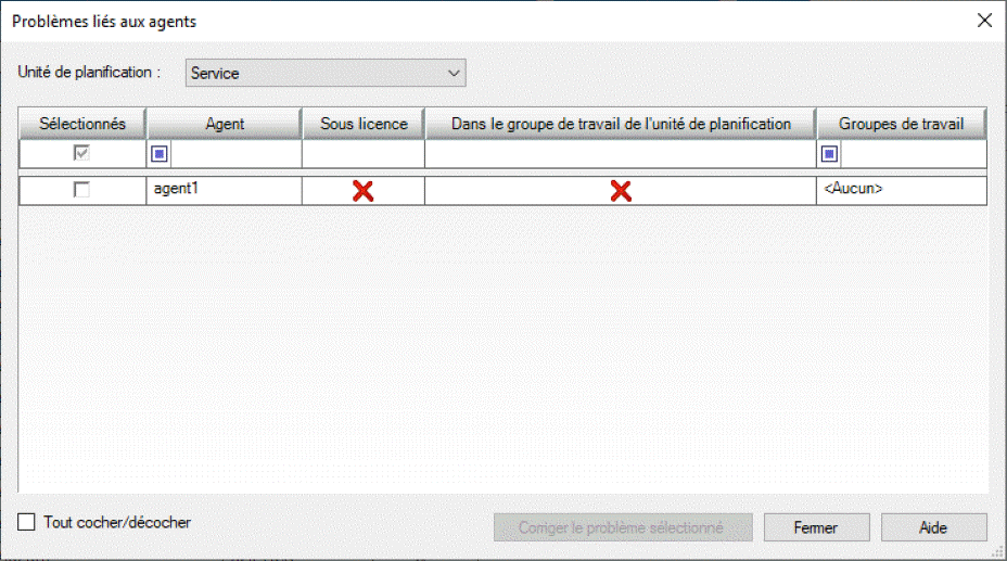 Dans le groupe de travail de l'unité de planification : lorsqu'une croix rouge apparaît dans cette colonne, cela signifie que l'agent n'appartient à aucun groupe de travail associé à l'unité de planification. Pour résoudre le problème, attribuez l'agent à un groupe de travail associé à l'unité de planification.