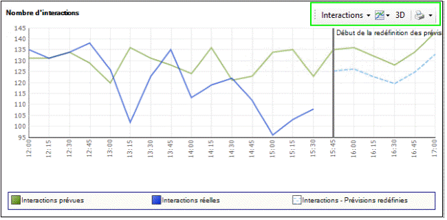 Vous pouvez utiliser la vue de graphe pour afficher les informations d'analyse Intraday dans un ou plusieurs onglets de graphes. Remarque : vous ne pouvez pas calculer les niveaux de service ou l'ASA sur le serveur CIC.