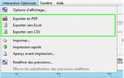 Pour exporter éventuellement les informations, sélectionnez l'une des options Exporter dans le menu Interaction Optimizer, ou à partir du bouton Exporter dans la barre d'outils.