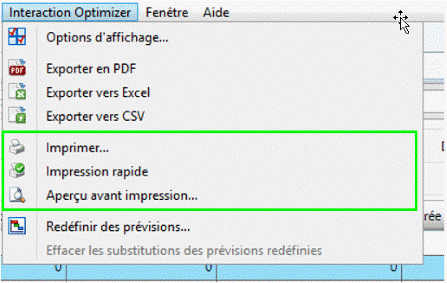 Pour imprimer éventuellement les informations de la vue Table de données, sélectionnez l'une des options Imprimer dans le menu Interaction Optimizer ou le bouton Imprimer dans la barre d'outils.