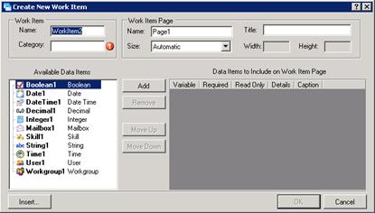 Note: The Create New Work Item dialog box creates a simply arranged work item page with labels and fields for the variables you selected, displaying them in the order you selected. When you display the page in your IPA Designer workspace, you can add more variables to the page, drag variable labels and fields to different locations, and edit the controls on the page. The Create a New Work Item dialog box simply gives you a "first draft" form that you can modify as needed.