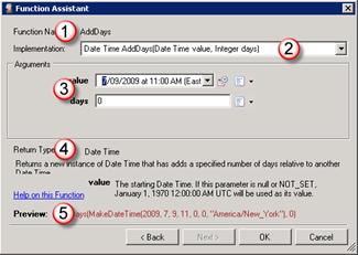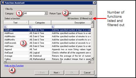 The Function Assistant wizard is a rich and flexible tool that walks you through the process of adding a function to your custom calculation. When you select a function in the list (3) and click the Next button, the wizard displays a dialog box that lets you enter values and parameters for the specific function you selected. Notable features of the initial dialog box (see figure, above) are: