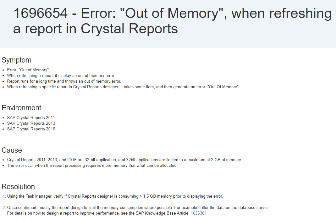 - Memory limitations found in the Crystal Reports v2013 exist in v2016 also. The Crystal Reports is a 32-bit application, meaning it is limited to a maximum of 2 GB memory. If the report being designed requires more memory than it can be allocated, out of memory exception will be displayed.