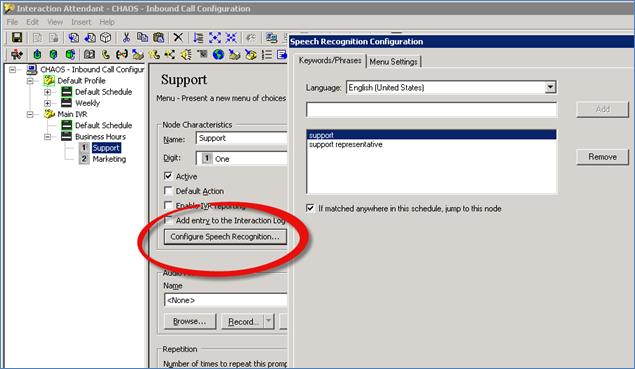 In Interaction Attendant, an administrator can enable profiles for Speech Recognition and configure simple words and phrases for menu nodes.