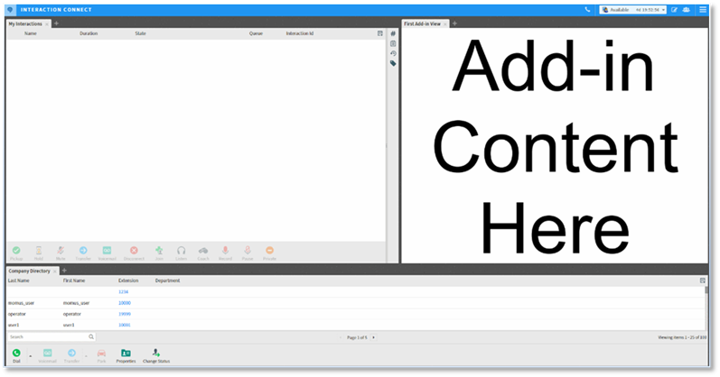 CIC 2016 R1 contains the initial phase of support for using custom add-ins with Interaction Connect. Add-ins allow customizations to Interaction Connect, beyond what is available out of the box. This support is similar to the add-in support that is available in Interaction Desktop, but with less functionality in this initial phase.