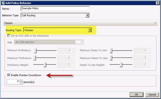 When configuring the call routing behavior type for a PreCall policy type, users can now select Preview in addition to the standard routing types Normal, Precise, and Do Not Call. Selecting the Preview routing type configures the system to wait until an agent is available, presents the agent with a screen pop that includes contact information, and then places a call object in an initializing state on the agent’s queue. The system either waits for the agent to manually make the call, or, if Preview Countdown is enabled, makes the call once the time on the countdown timer elapses.