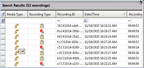 The type of recording, Snippet or Policy-based, appears in the new Recording Type column in the Search Results view.