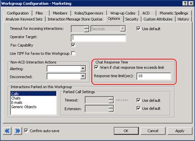 The chat interaction is on an ACD-routed workgroup, and the workgroup configuration specifies a Chat Response Time setting (see the related figure). If an internal user does not update the chat prior to the response time limit that is configured for the workgroup, the chat is highlighted. The highlighting goes away only after an internal user enters text into the chat. This feature is useful for organizations that want to remind or warn agents if a chat response time exceeds the specified time limit.