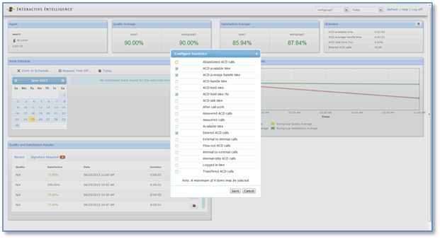 Agents can now see how their individual scores match up against their workgroup for quality and satisfaction averages. Also, they can select up to four statistics at a time to display agent-related statistics.
