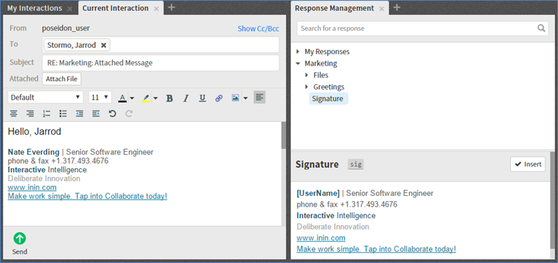 Under Signature in the following screen, the chosen response item includes the macro [Username]. In the interaction, the user’s name, Nate Everding, is filled in when the response item is inserted. Since the user name is filled in dynamically, every user could potentially use this one response item, eliminating the need to create a signature response item for each user.