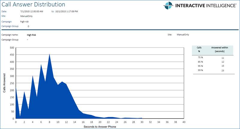 This report displays summary data and a graphical analysis of the number of seconds it takes to answer Interaction Dialer calls. This data provides guidance for setting the no-answer timeout value. The Show Detail parameter drives the display of the following summary data table.