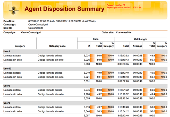 The Dialer Agent Disposition Summary report provides agent-assigned call dispositions by agent, with analysis of call counts and call lengths by disposition.