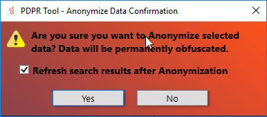 Note: By default, the PDPR Tool refreshes the search results to show that the data no longer appears in the search, and this refresh can add time to the operation. Clear the Refresh search results after Anonymization check box to prevent the search refresh. You can change the default value for this check box by editing the PDPRMTool.exe.config file and changing the RefreshGridPostAnonymization parameter value from true to false. Restart the tool after updating the .config file to see the changes.